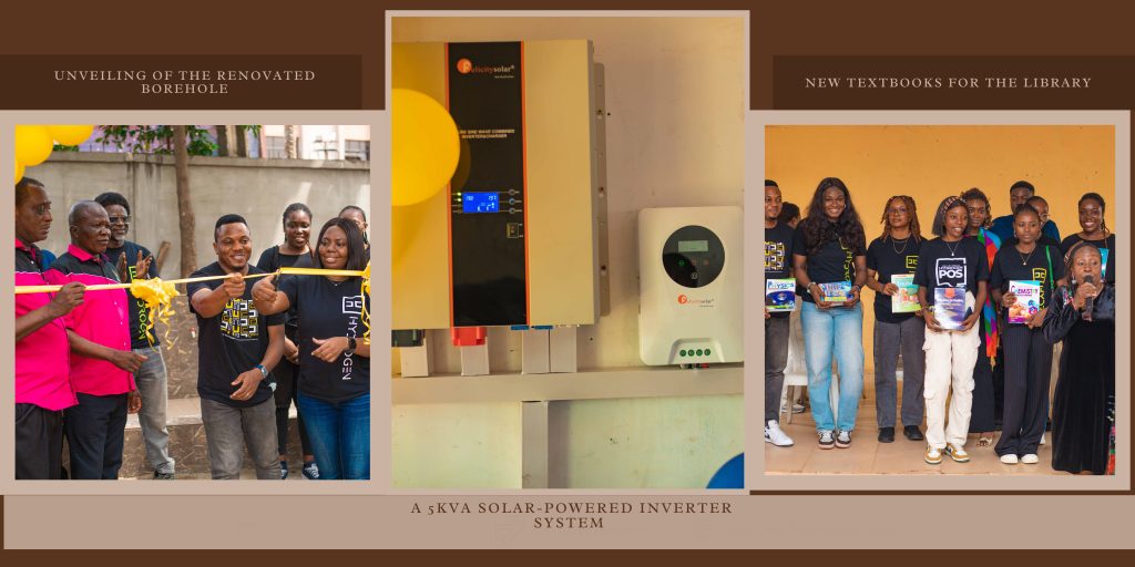 - A 5KVA solar-powered inverter system dedicated to powering the borehole pump and areas in the school, ensuring a reliable supply of clean water for students and staff. – Ensuring a consistent power supply to support learning and essential infrastructure.
