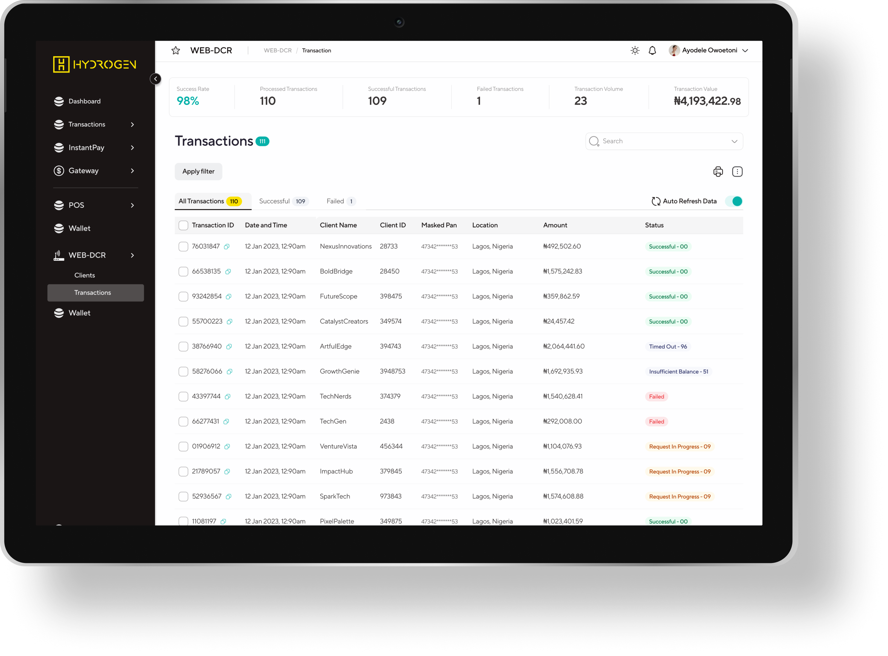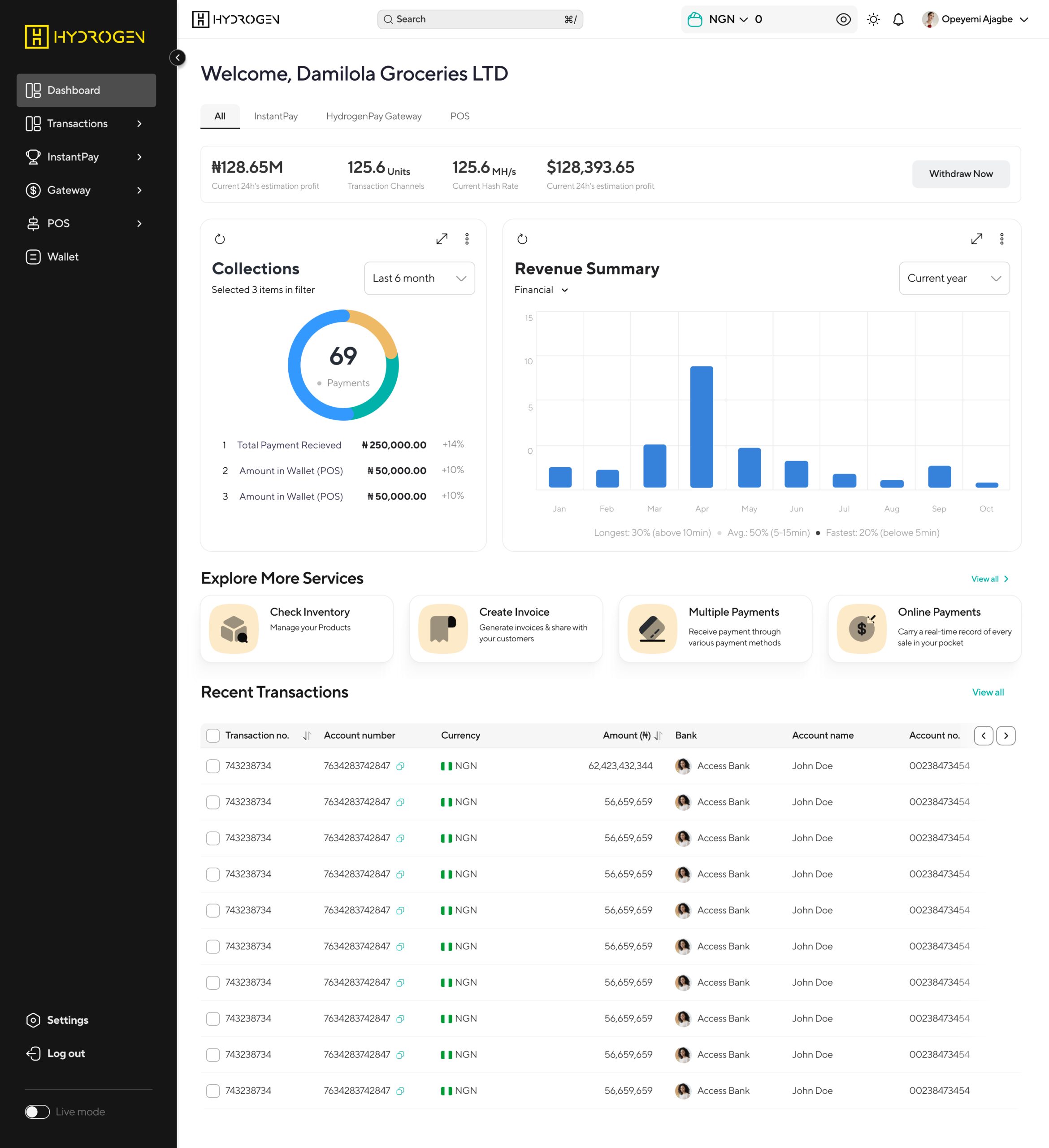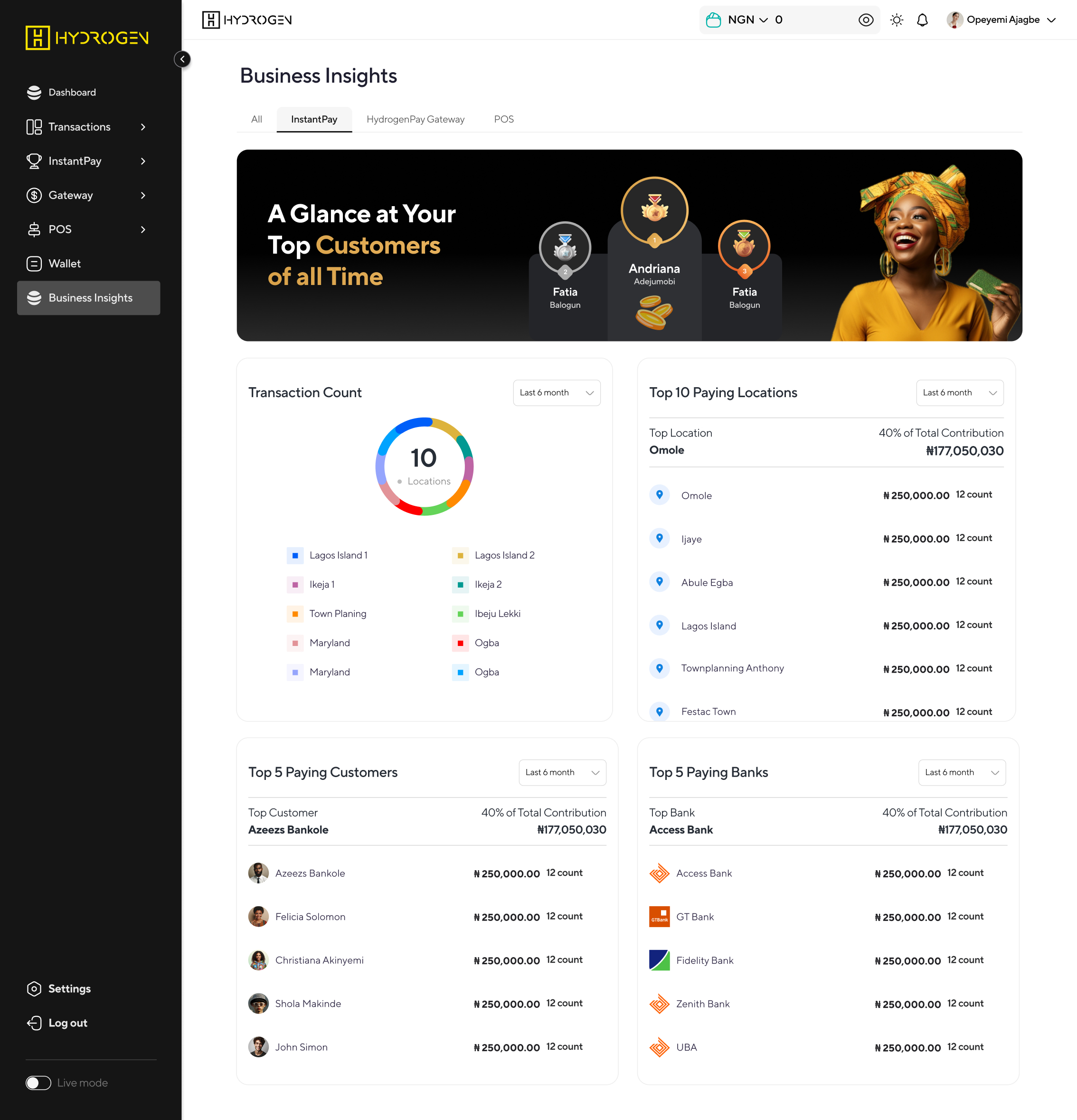 Get real-time data on your Hydrogen Instantpay dashboard for your different business locations.